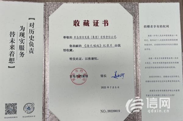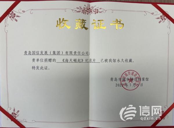 信网7月12日讯(记者 于晓)铭记历史,致敬城市。由青岛国信集团旗下国信传媒和海天中心联合出品的大型纪录片《海天崛起》即日起在腾讯视频等20余家媒体和平台展播。同时,这部长度近一个小时的纪录片被市委党史研究院、市档案馆、市城市建设档案馆永久收藏,青岛国信集团获得由官方颁发的收藏证书。