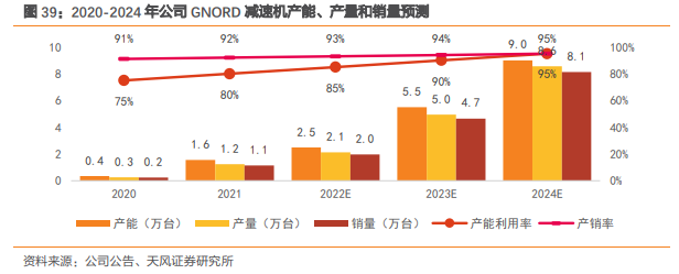 产能放量:公司2022-24年齿轮减速产量预计分别为50.97/53.96/56.96万台,销量分别为47.4/51.3/55.3万台。