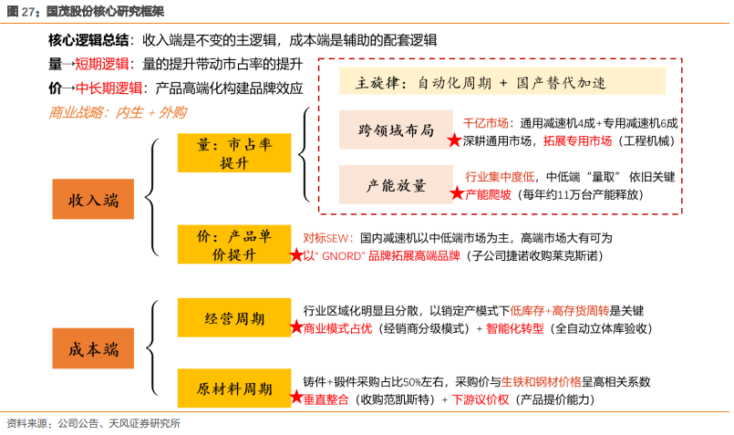 自动化周期大背景下,智能制造本土品牌份额有望迎来提升,公司是国产减速机龙头,应用范围渗透至国民经济各领域,短期量的提升带动市占率的提升,叠加成本端直接原材料价格的下降,分析师看好量价齐升打开成长空间。