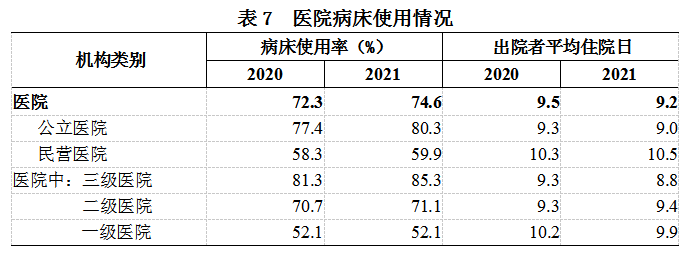 (三)病床使用。2021年,全国医院病床使用率74.6%,其中:公立医院80.3%。与上年比较,医院病床使用率增加2.3个百分点(其中公立医院增加2.9个百分点)。2021年医院出院者平均住院日为9.2日(其中:公立医院9.0日),与上年比较,医院出院者平均住院日减少0.3日(其中公立医院减少0.3日)(见表7)。