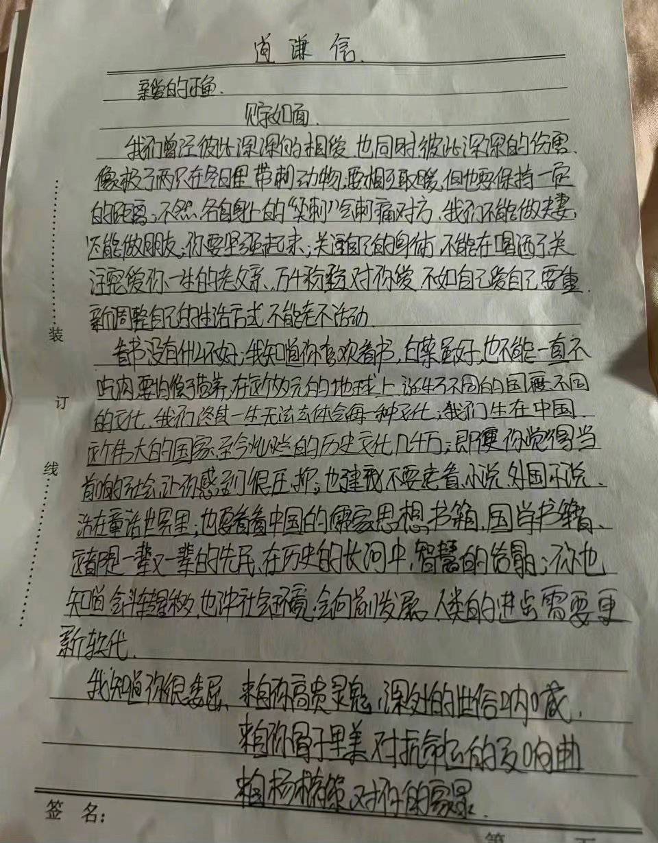 道歉信中,杨称,他们曾经彼此深深地相爱,也同时深深地彼此伤害。他觉得三生有幸遇到余秀华,和她在一起的日子喜怒哀乐都有,但静静回味一下,还是高兴大于悲伤,尽管还是用这样一种大家讨厌的方式离开。“我向你致歉,向那些牵连进来的(人)致歉。”杨槠策在信的最后又写道:“说过多次的话,还要说一遍,任何时候对任何人都不能带情绪,用夹杂粗话的方式沟通。一生很苦短,不能伤害自己又不能伤害别人,一句话让人笑,一句话让人跳,为什么我们不能说让别人高兴的话呢……我俩痛定思痛,都要静下反思,要收口、收心、收性……说是致歉信,但还是说了很多废话,希望你看了之后不要和文字生气,你真的很棒……”