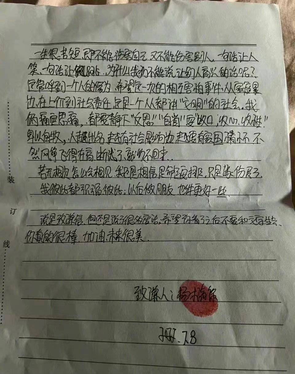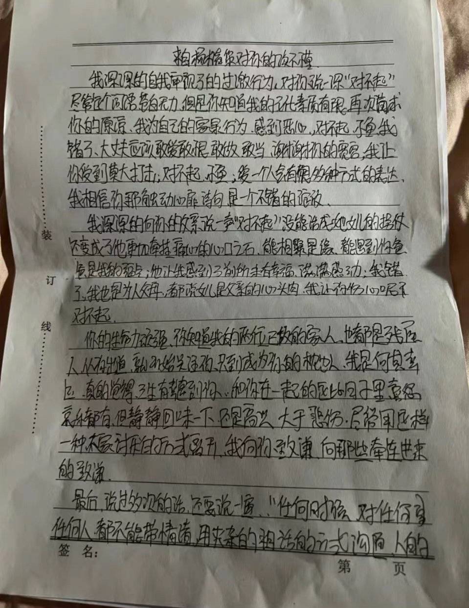 7月12日,杨槠策给余秀华手写的道歉信在网上被曝光,还上了网络热搜。信上有杨槠策的签名和手印。落款时间为2022年7月8日。该手写信一共3页。密密麻麻,字体稠密,有不少错别字,比如把“道歉信”写成了“道谦信”。在信中他审视了自己的过激行为,对余秀华说一声“对不起”,他写道,“对自己的家暴行为感到恶心”。对余秀华的父亲也说一声“对不起”,没能活成他女儿的拐杖,还变成了(让)他更加牵挂、痛心的心口之石。
