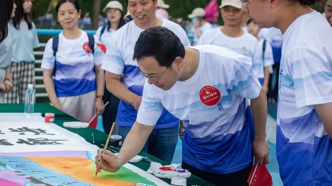 各支队伍踏上七彩喷绘布,携手同向,阔步前行,用脚印留下了一道亮丽道路,呈现了统一战线成员坚定不移跟党走,实干争先行的昂扬姿态。