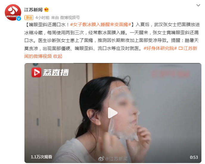 入夏后,武汉张女士把面膜放进冰箱冷藏,每周使用两到三次,经常敷冰面膜入睡。一天醒来,张女士竟嘴眼歪斜还漏口水。医生诊断张女士患上了面瘫,推测因长期熬夜加上面部受凉导致。提醒:酷暑天莫贪凉,出现面部僵硬、嘴眼歪斜、流口水等应及时就医。
