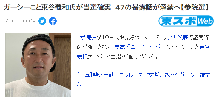 据《东京体育报》7月11日报道,因为爆料小栗旬、绫野刚等日本影星的私生活负面新闻而名声大噪的日娱“瓜主”——YouTube博主东谷义和(人称GASHI炮),此前宣布代表NHK党参加日本参议院选举,没想到真选上了。