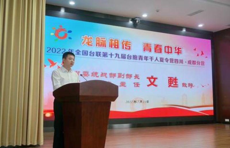 省委统战部副部长、省侨办主任文甦致辞,对台胞青年朋友的到来表示诚挚欢迎。他说,刚刚结束的四川省第十二次党代会进一步提出,强力推动成渝地区双城经济圈建设这一国家战略全面提速、整体成势。希望大家在夏令营活动中用心感受“巴蜀文化”、热心拥抱“西部机遇”、真心讲好“中国故事”,把所见所闻所想分享给更多台湾的亲人朋友。