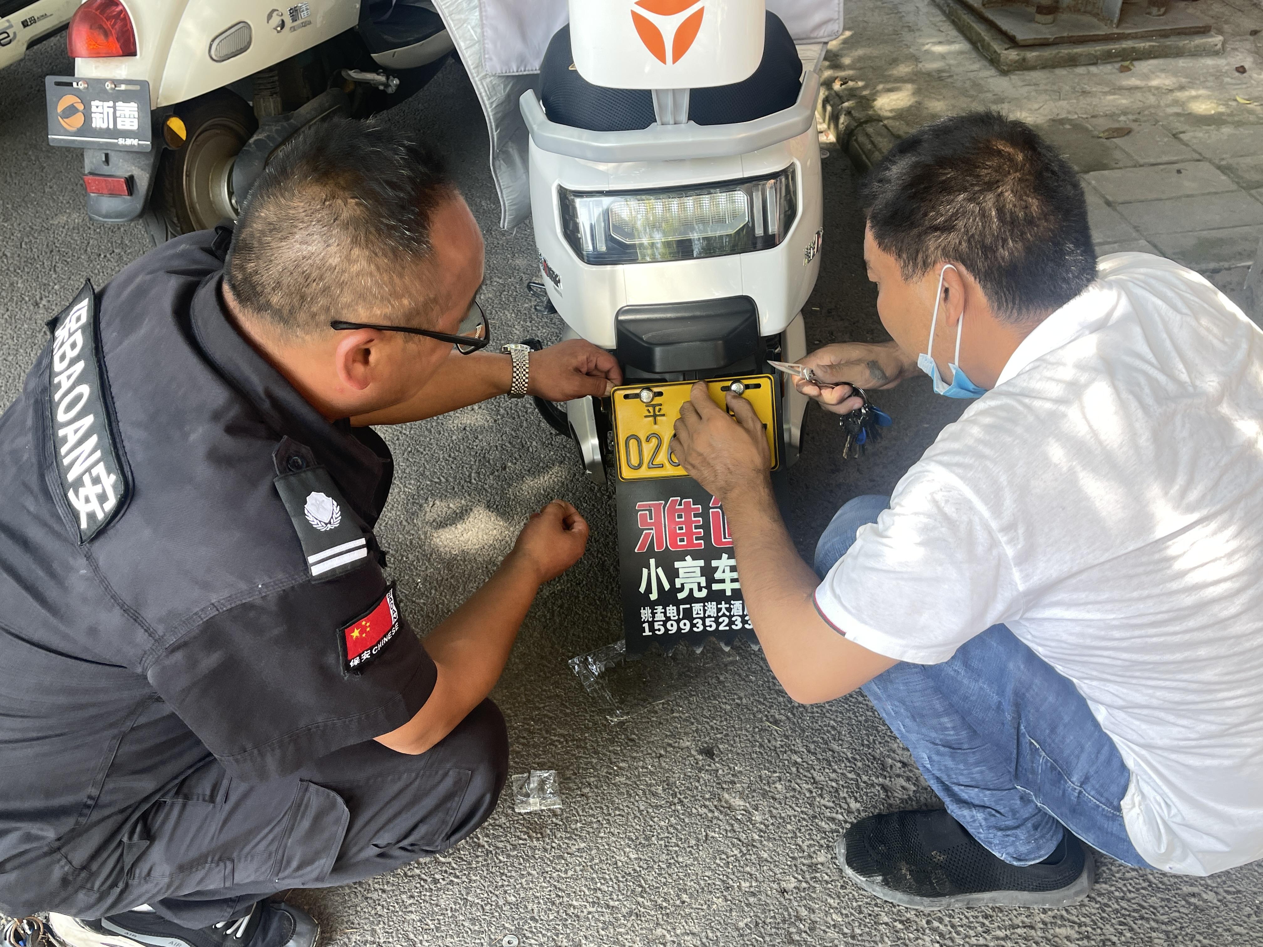7月11日上午,在湛河区姚孟街道姚电社区的3个电动车上牌点位上,社区居委会主任王秋田带领几名社区工作人员和大学生志愿者,引导居民有序排队、审核并登记信息、安装牌照。