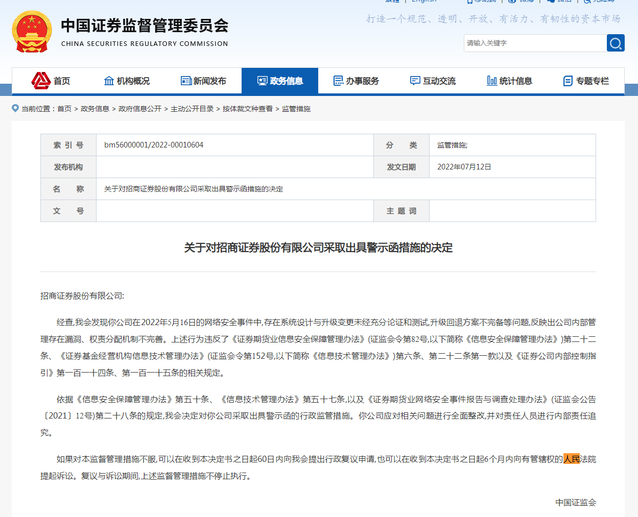 依据《信息安全保障管理办法》第五十条、《信息技术管理办法》第五十七条,以及《证券期货业网络安全事件报告与调查处理办法》(证监会公告〔2021〕12号)第二十八条的规定,我会决定对你公司采取出具警示函的行政监管措施。你公司应对相关问题进行全面整改,并对责任人员进行内部责任追究。