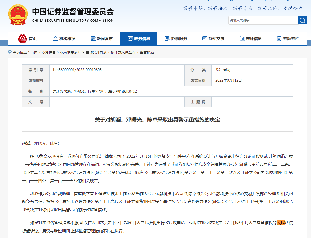 胡滔作为公司总裁助理、首席数字官,协管信息技术工作,邓曙光作为公司金融科技中心总监,陈卓作为公司金融科技中心核心交易开发部总经理,对相关问题负有责任。根据《信息技术管理办法》第五十七条以及《证券期货业网络安全事件报告与调查处理办法》(证监会公告〔2021〕12号)第二十八条的规定,我会决定对你们采取出具警示函的行政监管措施。
