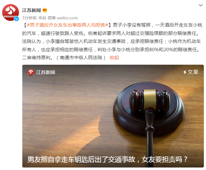 男子小李没有驾照,一天酒后开走女友小桃的汽车,超速行驶致路人受伤。伤者起诉要求两人对超过交强险限额的部分赔偿责任。法院认为,小李擅自驾驶他人机动车发生交通事故,应承担赔偿责任;小桃作为机动车所有人,也应承担相应的赔偿责任,判处小李与小桃分别承担80%和20%的赔偿责任。二审维持原判。(南通市中级人民法院)