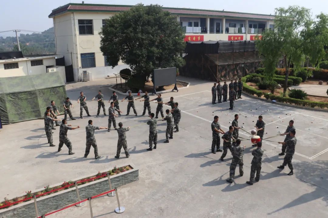 所有队员握住绳圈并拉紧坚持1分钟,志愿者能够行走一圈,培养新兵建立团队内部的信任感和依存度,发扬团队精神,互帮互助,感悟制度的制定与保障对完成任务的价值,让新兵认识到理解、信任和承诺的重要性。