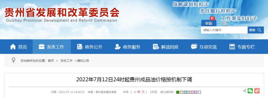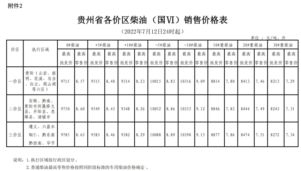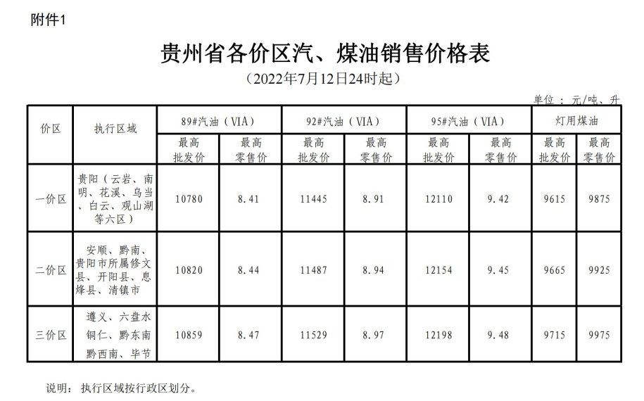 根据国家成品油价格形成机制,国家发展改革委决定自2022年7月12日24时起下调国内成品油价格。按照国家相关调整要求,贵州省89#汽油(国VIA)、0#柴油价格每吨在现行标准基础上分别降低360元和345元,具体价格可由各经营企业在不超过最高批发、零售价格的前提下确定。调整后各油品具体最高价格见附件。