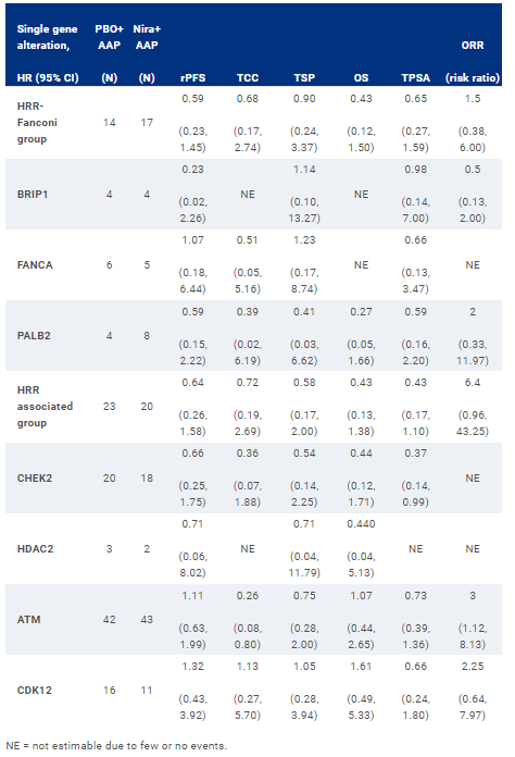 MAGNITUDE研究中使用尼拉帕利(NIRA)和阿比特龙加泼尼松(AAP)在转移性去势抵抗性前列腺癌(mCRPC)患者及同源重组修复(HRR)基因突变的逐基因分析
