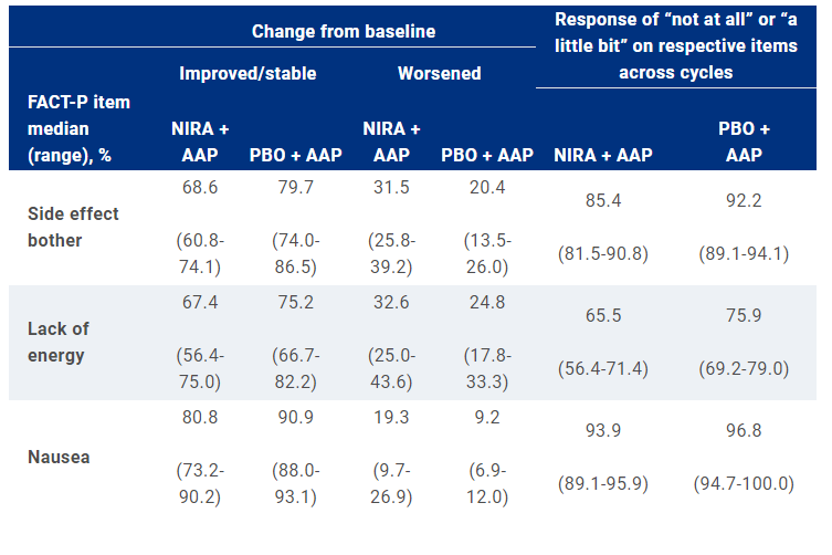 结果:FACT-P和BPI-SF的符合率均& 80%。大多数患者会随着时间的推移保持较低的疼痛水平。重复测量分析显示,随着时间的推移或两组之间的疼痛没有临床意义的差异。两组疼痛强度均未达到中位TTD。在第25百分位,NIRA+AAP与PBO+AAP相比,疼痛强度有延长的趋势(11.1个月vs10.1个月;HR,0.87;95%CI,0.61-1.24)。NIRA+AAP维持了HRQoL,而FACT-P总值随时间推移在两组间无临床意义差异。与PBO+AAP相比, NIRA+AAP 组FACT-P身体健康状况在早期有更大的恶化趋势,其原因是NIRA+AAP已知安全性范围内的事件(由于副作用导致的乏力和恶心);但总体而言,大多数患者报告的副作用影响很小。