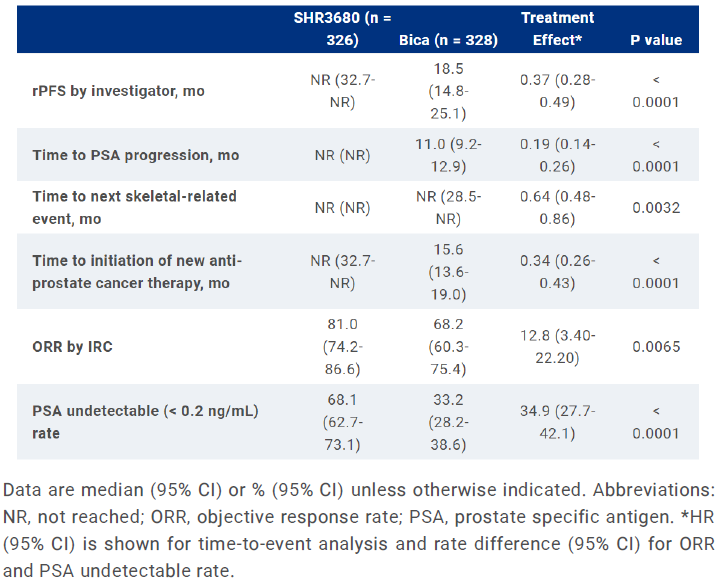 结果:654名患者被随机分配至SHR3680组 (n = 326)和B比卡鲁胺组 (n = 328),在数据截止时,SHR3680组的中位随访时间为22.1个月,比卡鲁胺组为20.4个月。与比卡鲁胺联合ADT相比,SHR3680联合ADT显着降低了放射学进展或死亡风险(HR,0.44;95% CI,0.33-0.58;p < 0.0001;中位值,未达到vs 25.1个月)。OS 数据不成熟,但与比卡鲁胺组相比,SHR3680组的OS有所改善(HR,0.58;95% CI,0.42-0.80;p = 0.0009)。所有次要疗效终点均支持 SHR3680联合ADT(见表格)。所有级别的任何原因导致的不良事件发生率两组是相似的,SHR3680组和比卡鲁胺组的≥3 级治疗相关不良事件分别是19.2% 和 13.9% ,SHR3680组无癫痫发生。