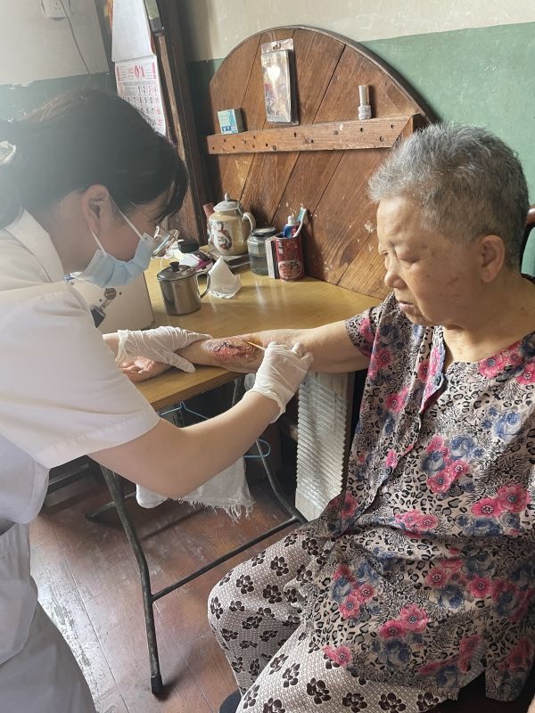 六角亭街社区卫生服务中心医生上门给老人清理烫伤伤口。通讯员胡莎供图