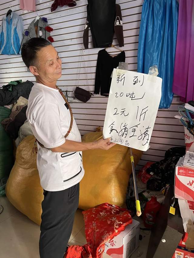 “这里是3块钱一件的棉衣,有12000件,皮草稍贵一些大概10块一件左右,还有那些裤子是2块一件。”这些货价,张大爷一天要报无数遍。“前几天刚卖掉20吨共8万块钱的货,所有的货只要凑够1万块就包邮。”