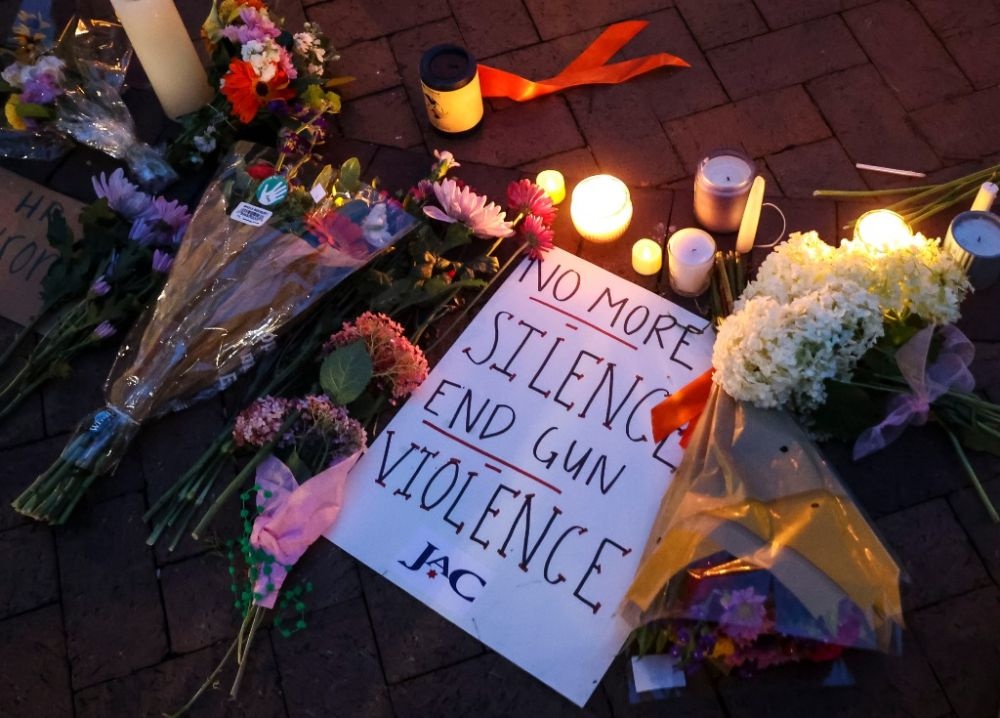 7月5日,在美国伊利诺伊州海兰帕克市,悼念者摆放写着“不再沉默,停止枪支暴力”的标语牌。新华社发(乔尔·莱纳摄)