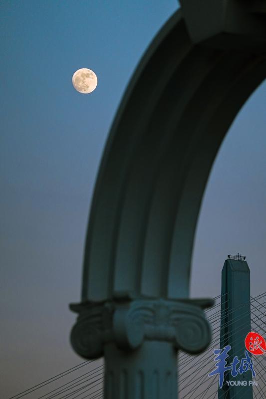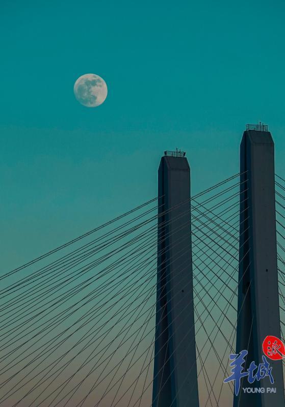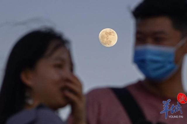7月12日傍晚6时30分许,从广州海珠区眺望洛溪大桥,雏形已现的圆月与赏月的人、远处的桥交相辉映。