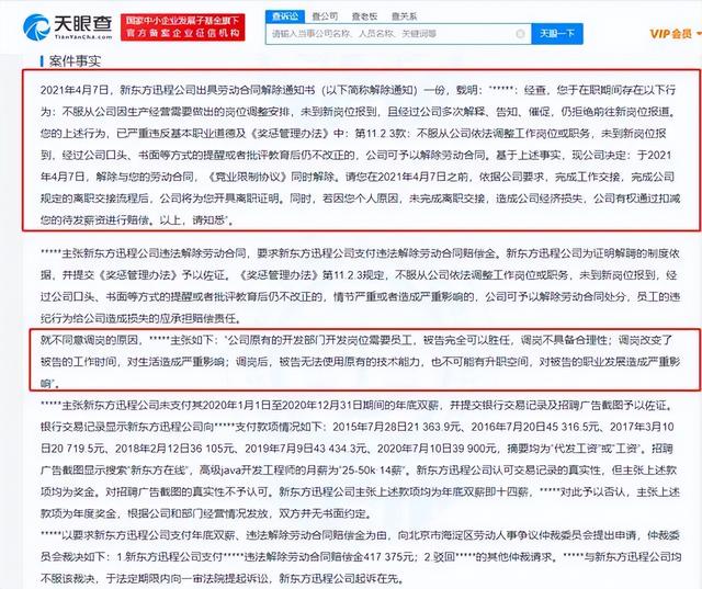 文书显示,新东方以葛某不服从公司因生产经营需要做出的岗位调整安排,未到新岗位报到为由解除劳动合同,葛某认为调岗不具备合理性,要求新东方支付年底双薪和解约赔偿金。一审法院审理认为,葛某提交证据不足以证明关于年底双薪的主张,新东方迅程公司并未就生产经营情况发生变化举证,且葛某从“资深开发工程师”调整为“技术支持工程师”,会对其职业发展产生影响。新东方迅程公司对葛某进行的调岗缺乏相应的合理性,葛某有权拒绝。一审法院裁定,新东方迅程公司支付葛某违法解除劳动合同赔偿金38.25万元。