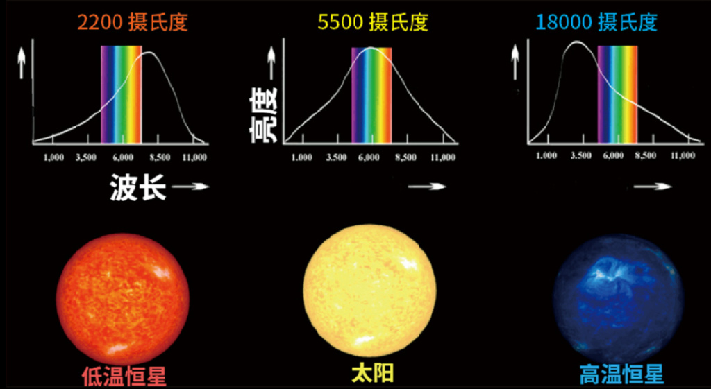 恒星颜色不同的原理。光子的波长由低到高时,颜色逐渐由“冷”到“暖”
