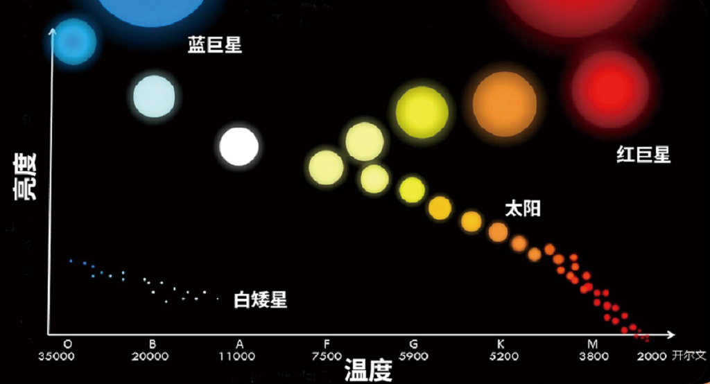 天体在温度、亮度上的分布。可以看到天体的颜色和其温度、大小有着对应关系(0开尔文相当于-273.15摄氏度)