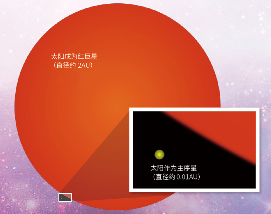 科学家根据太阳的质量和演化现状,计算出未来50亿年后,太阳也会成为一颗老年的红巨星(1AU表示地球到太阳的距离,约为15亿千米)(图片来源/维基百科)