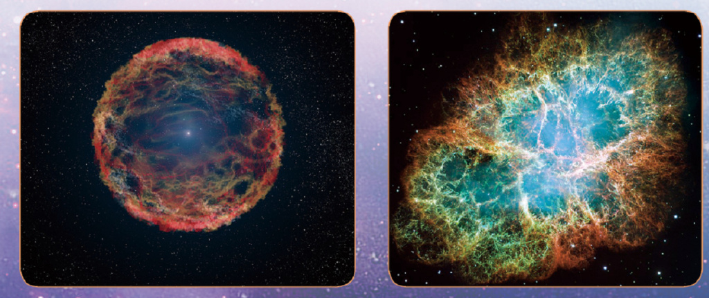 (左)超新星爆发时的概念图(图片来源/美国国家航空航天局)(右)超新星遗迹一蟹状星云(图片来源/哈勃太空望远镜)