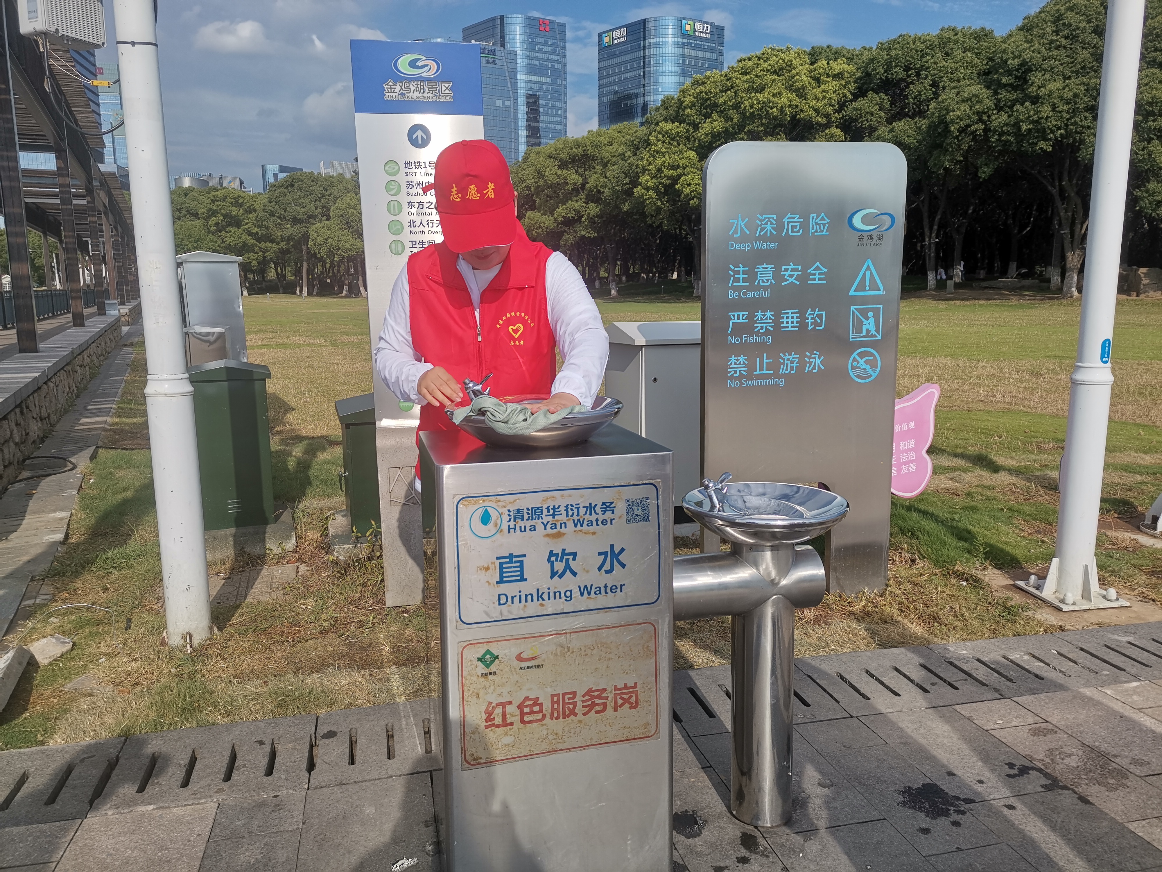 上午7时整,志愿者们放弃了周六休息时间,早早便集合完毕,在闷热的天气中,有分工、有组织地开始了志愿服务工作。有人清洁直饮水设备,有人捡拾垃圾,有人指导居民直饮水使用,有人对用水常识和环保知识进行宣传......