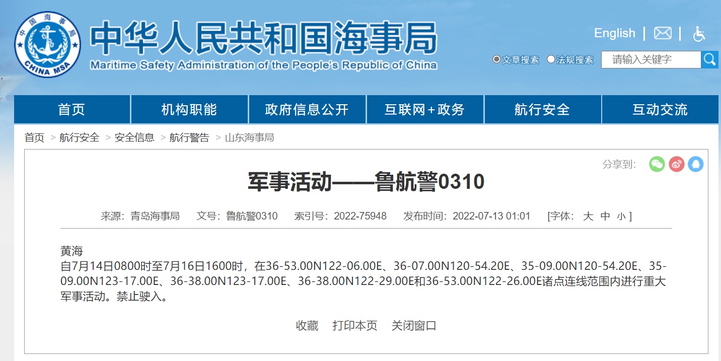 据青岛海事局,7月14日8时至16日16时,黄海部分海域进行重大军事活动,禁止驶入。