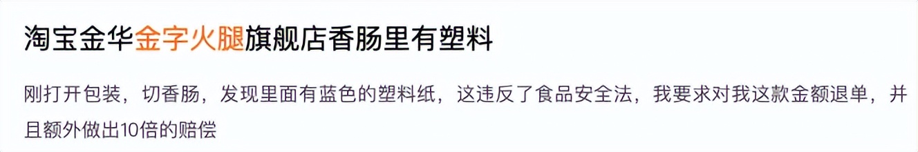 除此之外,在黑猫投诉中,有消费者称在“金华金字火腿旗舰店购买的腊肠中,两次发现有异物。商家不按法定金额补偿,说无法证明是它们家腊肠中的异物。”