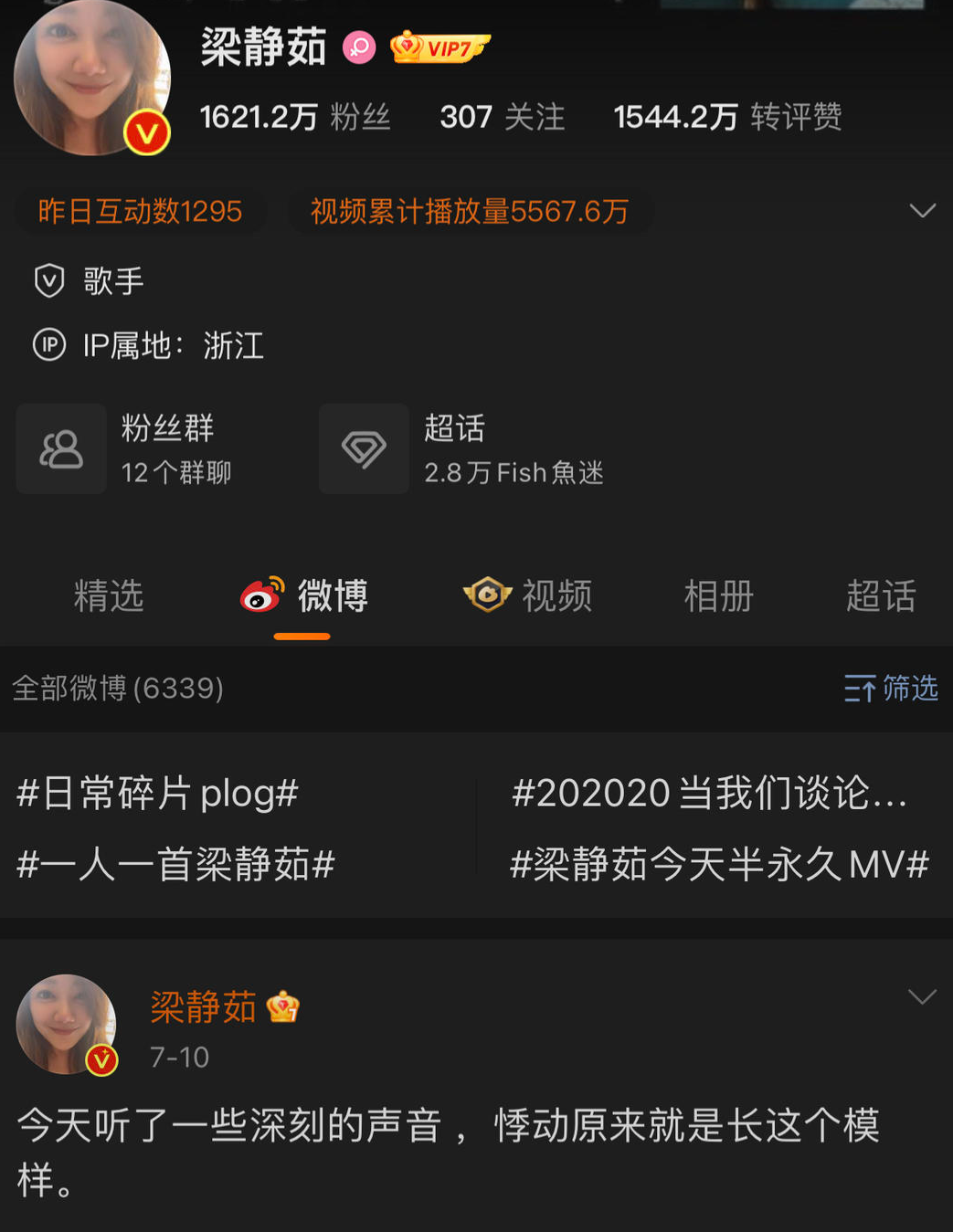 查阅梁静茹的微博还能发现,她此前从新加坡抵达中国福建开始按防疫要求隔离。在7月8日,她的微博IP属地变成了浙江。梁静茹最新的一条微博发布于7月10日,“今天听了一些深刻的声音,悸动原来就是长这个模样。”