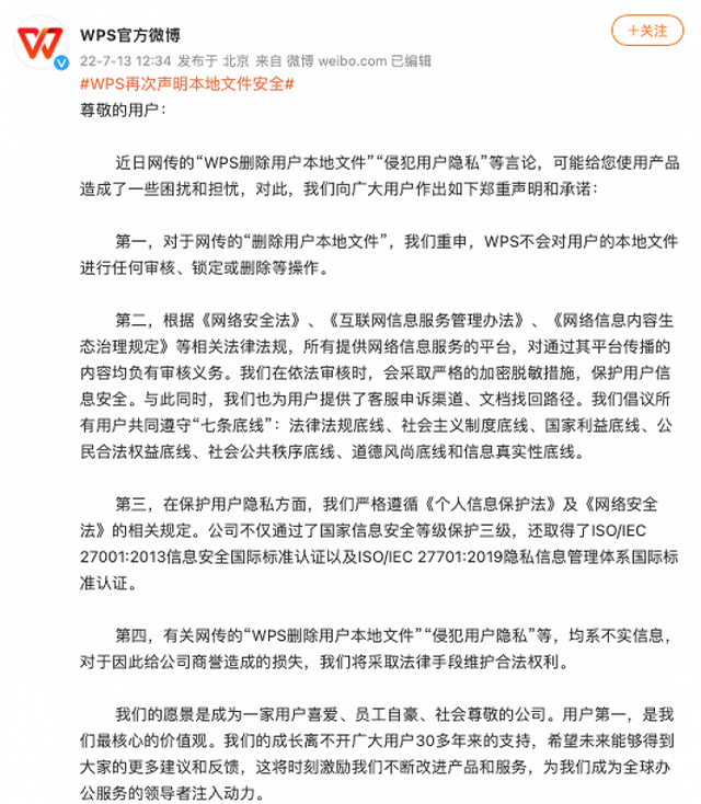 第一,对于网传的“删除用户本地文件”,我们重申,WPS不会对用户的本地文件进行任何审核、锁定或删除等操作。