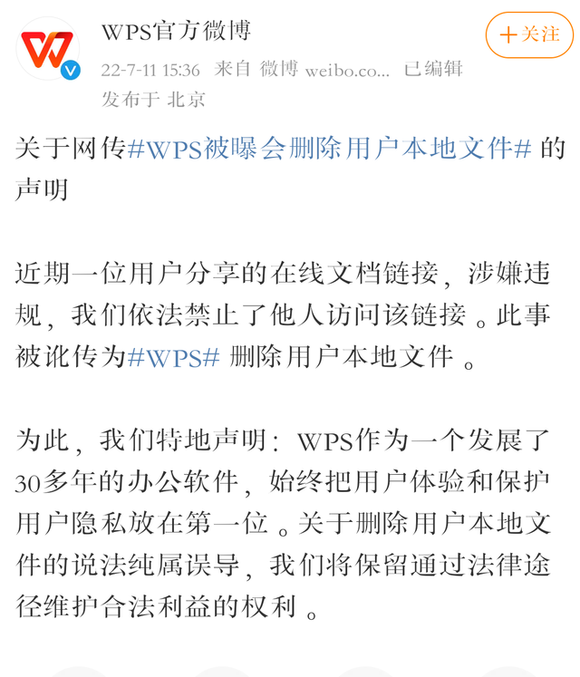 7月11日上午,“WPS删除用户本地文件”话题登上热搜,引发众多网友热议。