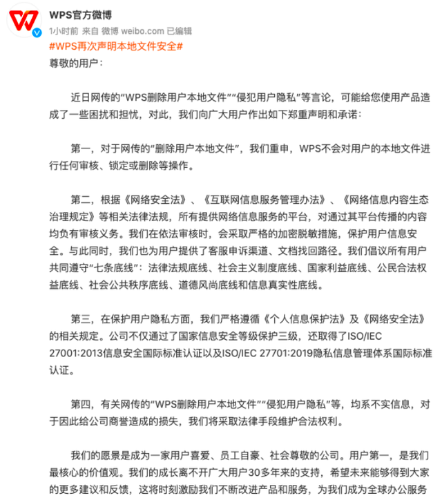 7月13日,WPS官方微博 再次发文称,近日网传的“WPS删除用户本地文件”“侵犯用户隐私”等言论,可能给您使用产品造成了一些困扰和担忧,对此,我们向广大用户作出如下郑重声明和承诺: