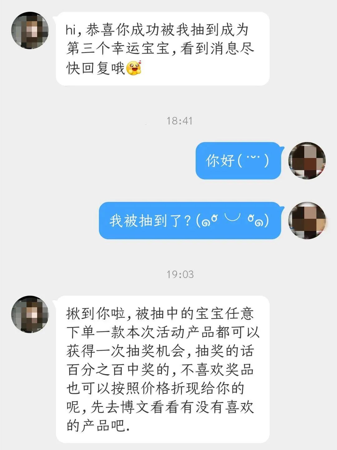 “恭喜你成功被抽到成为第三个幸运宝宝,任意下单一款活动产品就可以参加抽奖活动,百分百中奖,不喜欢奖品也可以按照价格折现。”