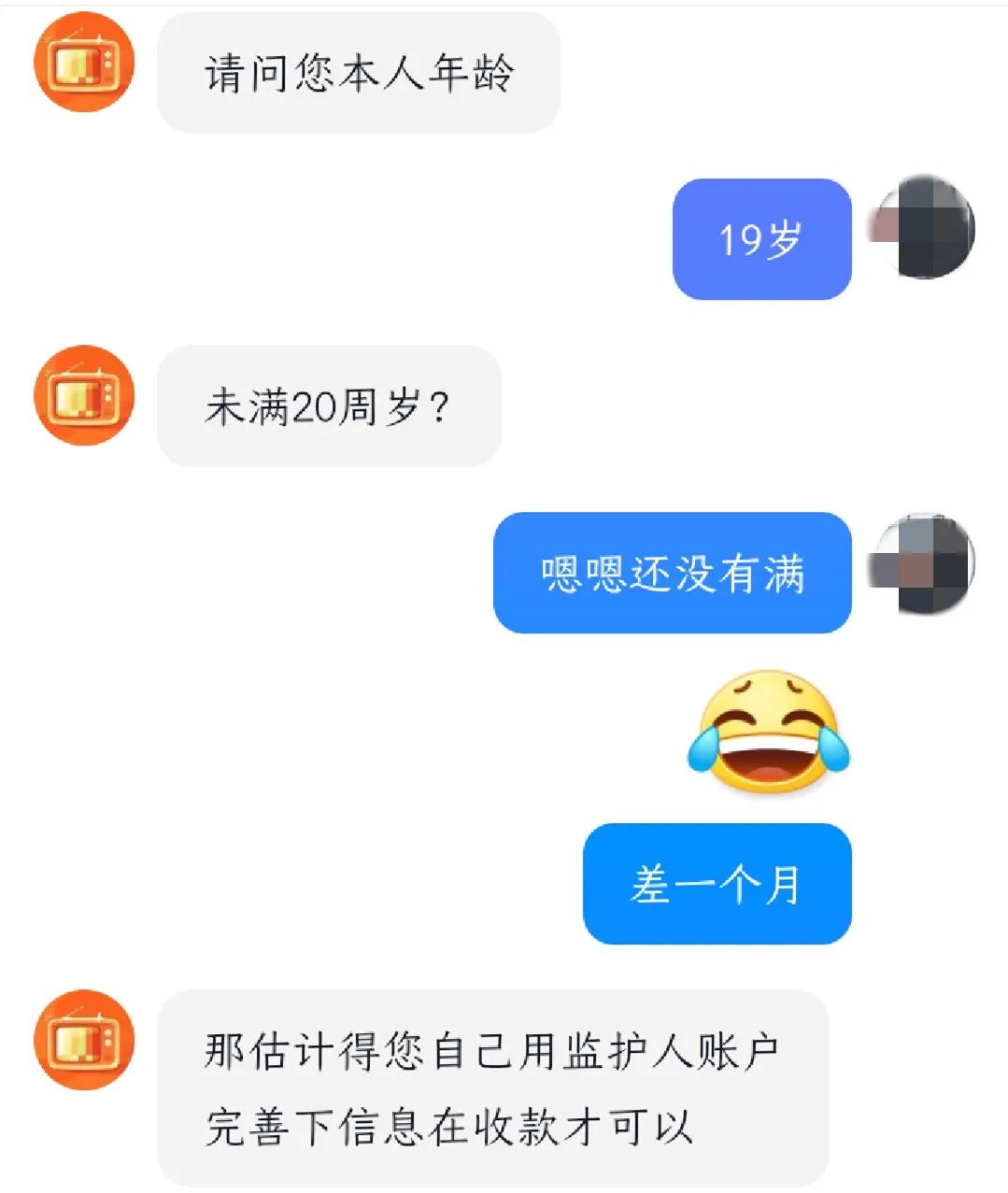 此时对方推了财务客服的抖音号,说联系客服即可提现。添加了客服后,称小X未满20周岁,需要用监护人账户完善下信息才能收款。