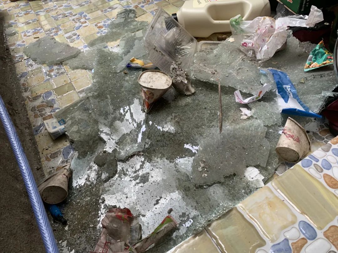 “石头掉下来碎成了两半,一半大点一半小点,顶棚的玻璃是钢化玻璃,平时我踩上去打扫卫生都没事,现在直接砸穿,这要是砸到人真的不得了。”