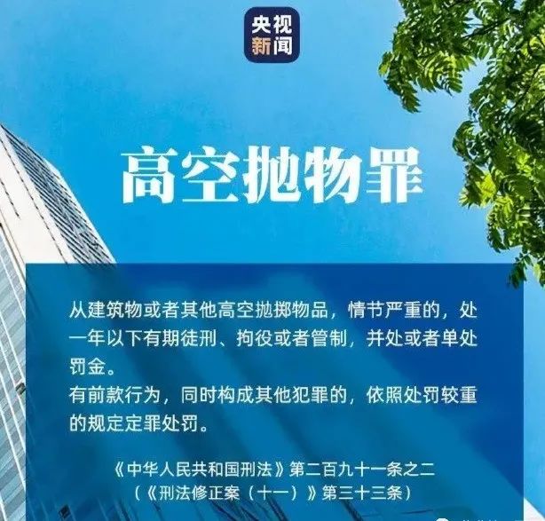 《刑法》第二百九十一条之二:高空抛物罪从建筑物或者其他高空抛掷物品,情节严重的,处一年以下有期徒刑、拘役或者管制,并处或者单处罚金。有前款行为,同时构成其他犯罪的,依照处罚较重的规定定罪处罚。