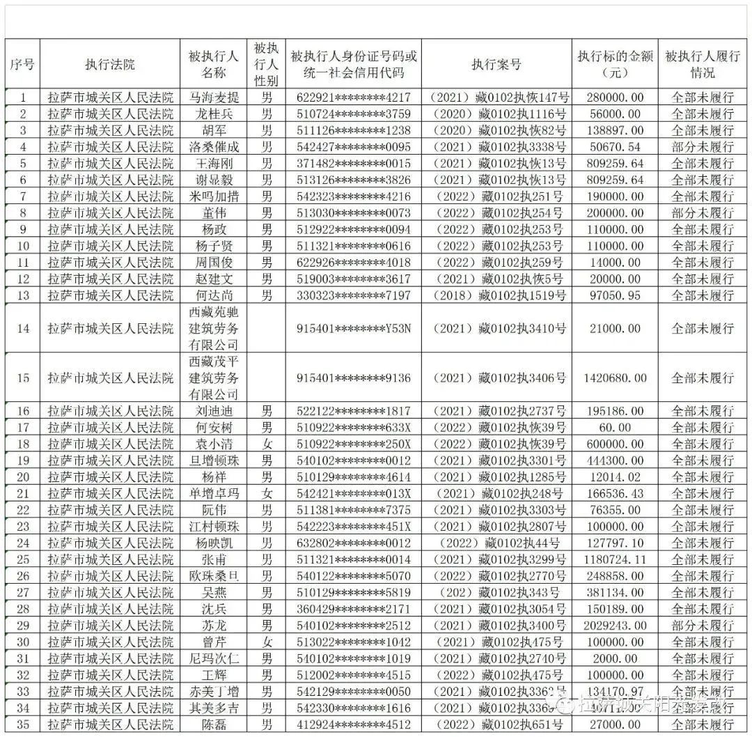 为进一步推进拉萨市社会诚信体系建设,发挥失信惩戒和诚信约束的积极作用,营造讲诚实、守信用的舆论环境、经济环境和社会环境,现对拉萨市城关区人民法院失信被执行人员进行曝光。