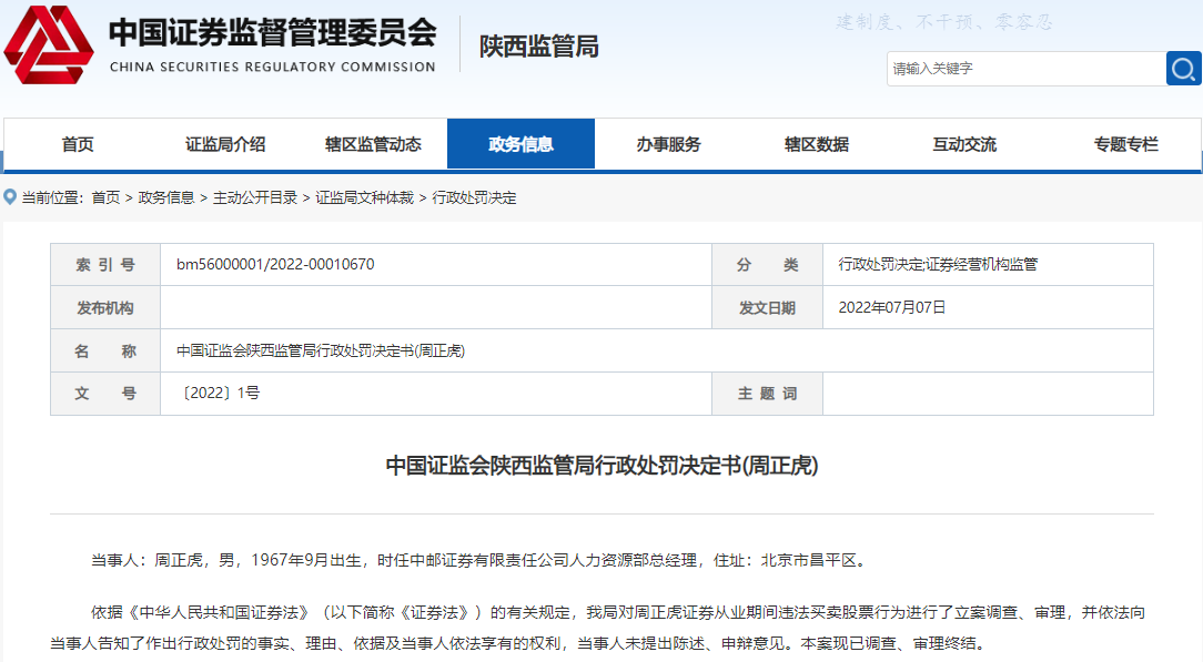 近日,陕西证监局披露了一则证券从业人员炒股的处罚。据披露,2021年4月27日至今,周某虎担任中邮证券人力资源部总经理,为证券公司从业人员。任职期间,周某虎使用本人手机下单操作“周某虎”证券账户,分别买入“东山精密”500股、“领益智造”1000股,累计成交金额15850元。