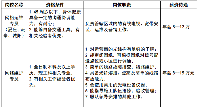 本次招收网格运维专员5人、网络维护专员1名,具体岗位信息如下: