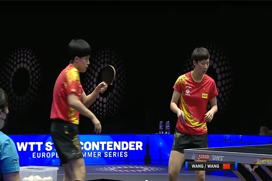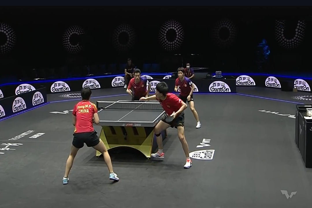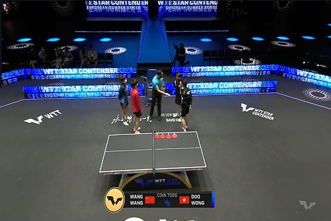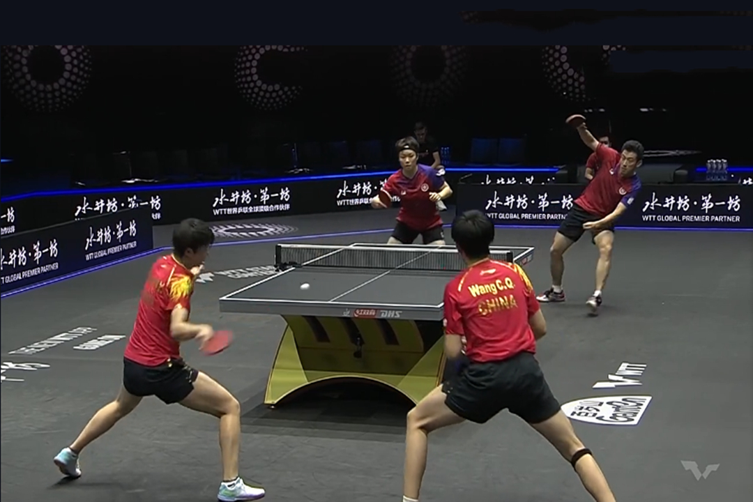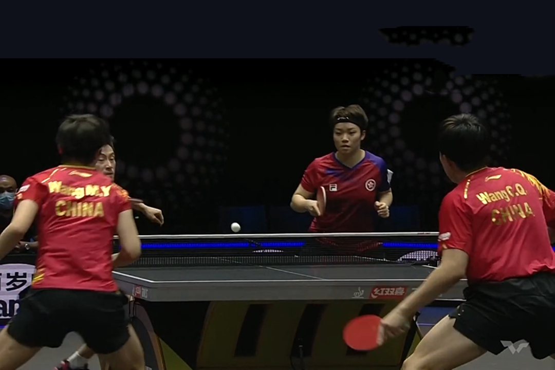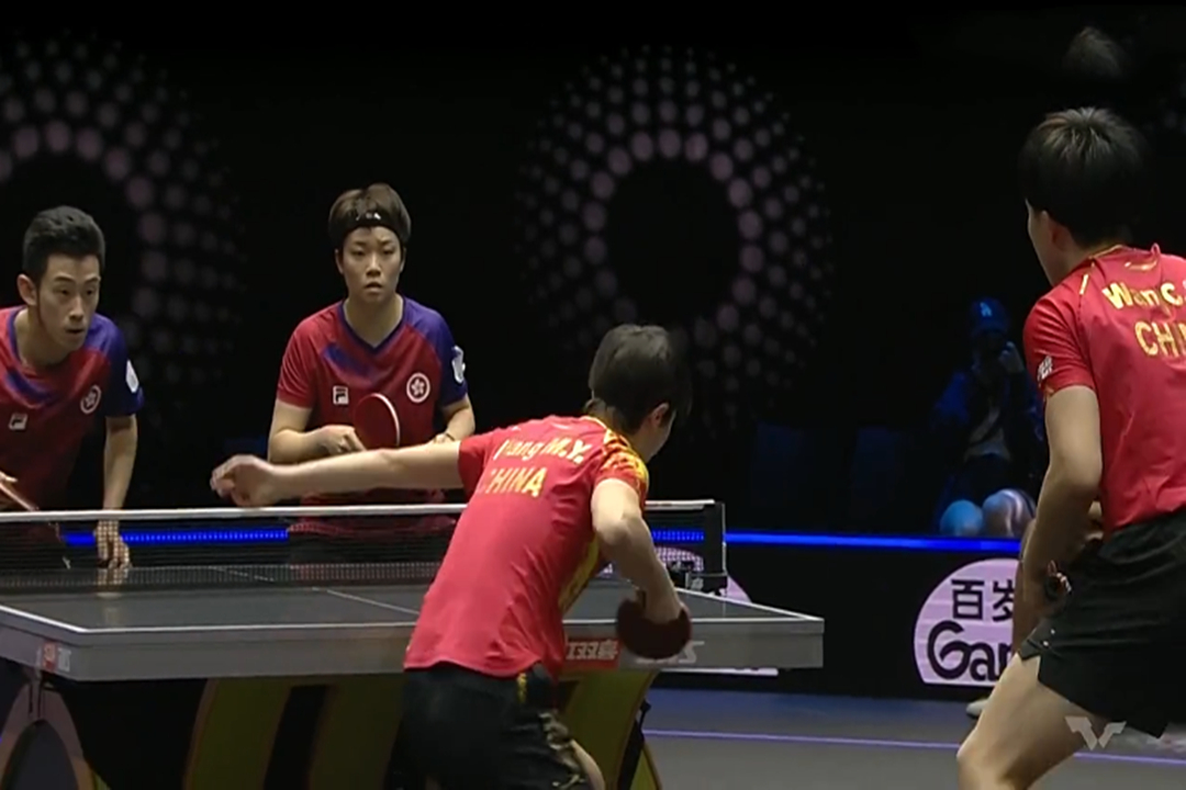 香港队双打实力一点也不弱,质量、落点都很高,虽然“王炸”组合利用相持能力追了两分,但是由于局中比赛落后太多分,比分还是来到了10:7,香港队领先;但是裁判认为这个球擦边后落到摄像机上,不算数,比分被改为9:8,国乒落后一分;