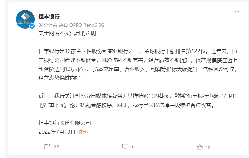 7月13日,恒丰银行在官方微博发布关于网传不实信息的声明称,近日,我行关注到部分自媒体转载名为某推特账号的截图,散播“恒丰银行也破产在即”的严重不实言论,扰乱金融秩序。对此,我行已采取法律手段维护合法权益。