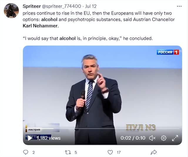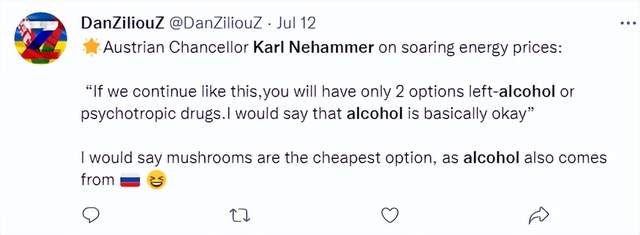 “奥地利:酒精可能是欧洲人的最后手段”,RT以此为题报道称,内哈默表示,欧盟必须采取措施打击价格上涨和能源成本,“这样我们才不会推高通胀,而是努力共同控制通胀”。内哈默还向党内同僚强调,这“绝非易事”。