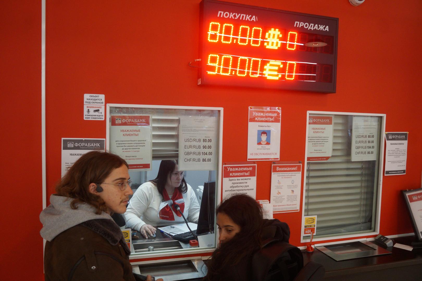↑资料图。3月9日,俄罗斯莫斯科一家银行显示的美元、欧元兑卢布汇率
