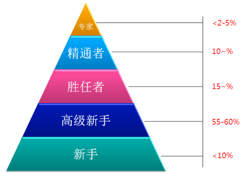 人们对一项专业技能的熟练程度,可以分为新手、高级新手、胜任者、精通者和专家。