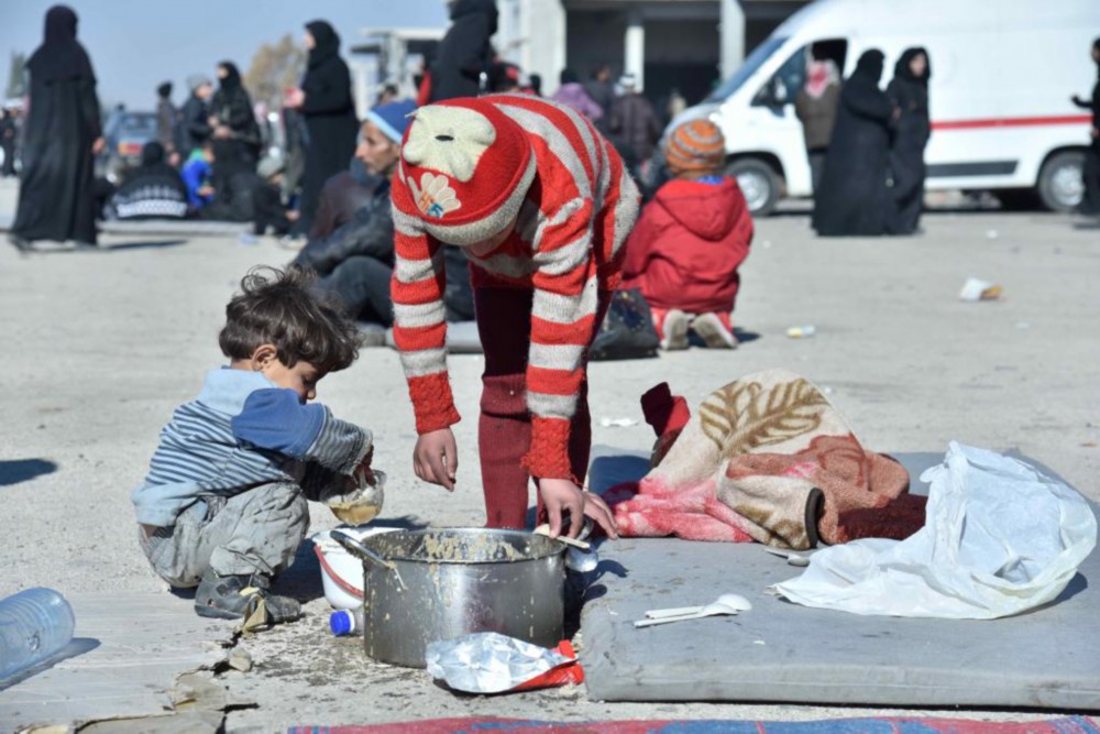 2016年12月9日,在叙利亚北部城市阿勒颇市吉卜林临时安置点,从反政府武装控制区撤出的儿童在吃饭。近年来,美国以反恐等种种理由,对阿富汗、伊拉克、叙利亚、利比亚等国家动武,造成这些国家动乱不止,大量无辜民众伤亡,许多人沦为难民。(新华社记者杨臻摄)