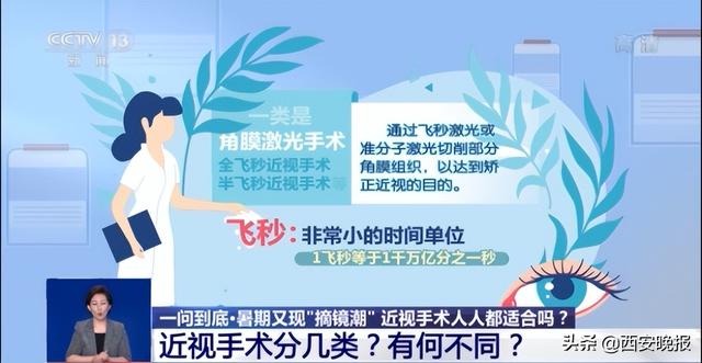 一类是角膜激光手术,如全飞秒近视手术,半飞秒近视手术等,通过飞秒激光或准分子激光切削部分角膜组织,以达到矫正近视的目的。在这儿还要向大家科普一下飞秒的概念。所谓飞秒是一种非常小的时间单位。有多小呢?1飞秒等于1千万亿分之一秒。而飞秒激光就是一种以脉冲形式发射的激光,持续时间只有几个飞秒。