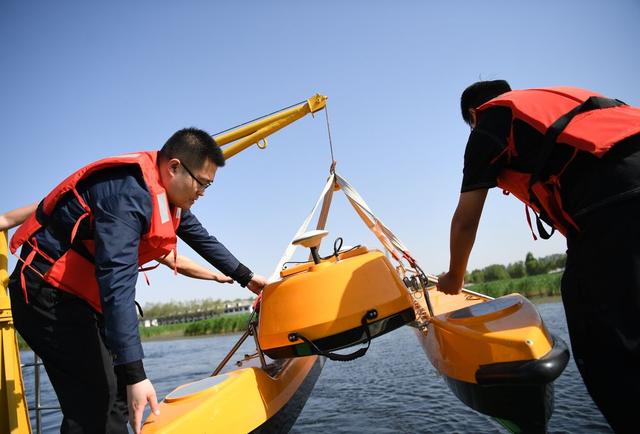 工作人员准备把水质监测无人船下放白洋淀水面。(新华社记者 朱旭东 摄)